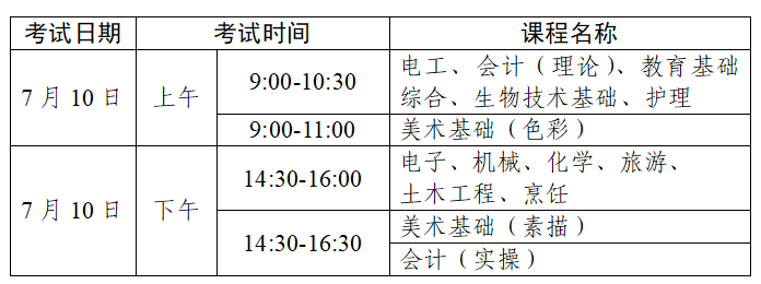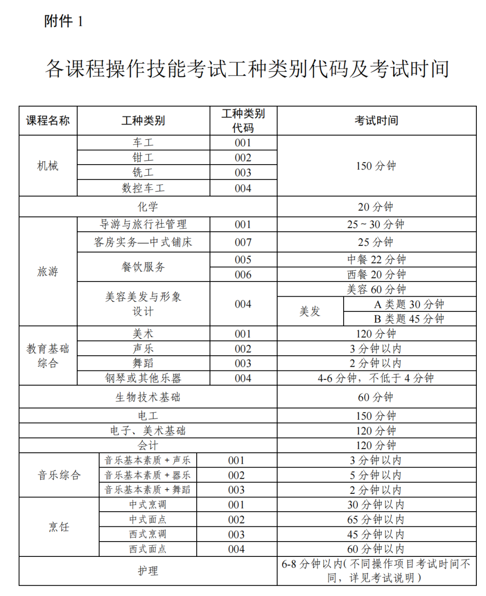 2.其他課程類別操作技能考試由各市招生考試機構根據實際情況在6月28日至7月10日內完成。各門課程操作技能考試工種類別代碼及考試時間詳見附件1。
