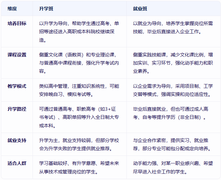 真相:兩者無優劣之分,關鍵看是否符合個人規劃。若盲目選擇升學班但缺乏學習動力,可能浪費3年時間;若選擇就業班但后期想升學,可通過成人教育提升學歷(但含金量低于全日制)。